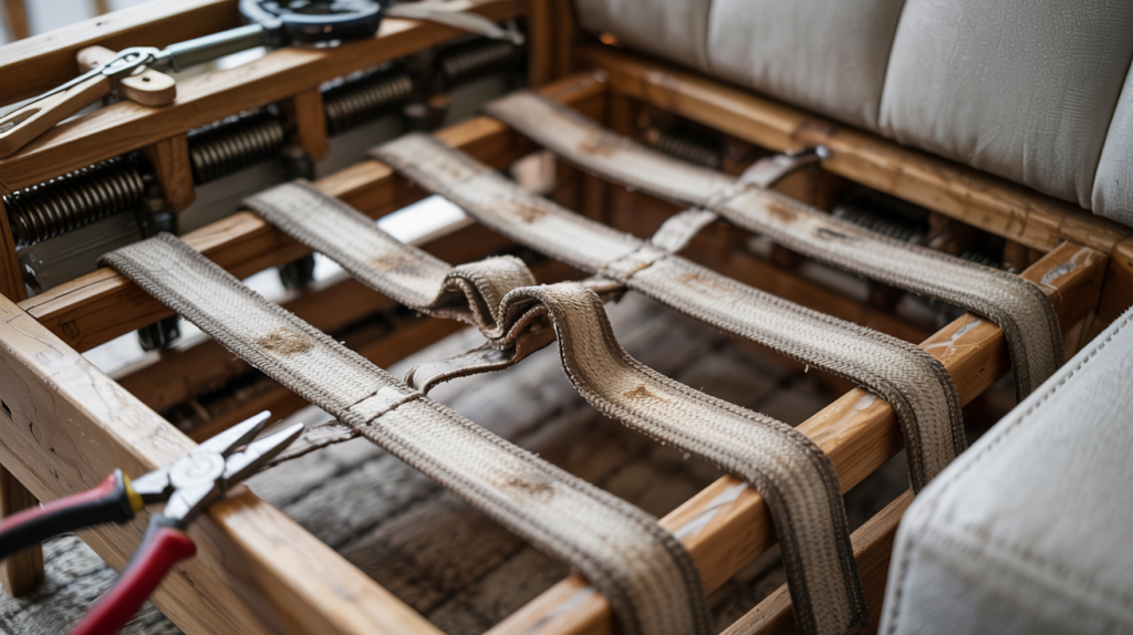 Flip your sofa and unscrew the bottom cover. You’ll see a grid of woven straps. If they look loose or broken, it’s time to replace them. Use a staple gun and webbing stretcher to install new webbing tightly across the seat frame.