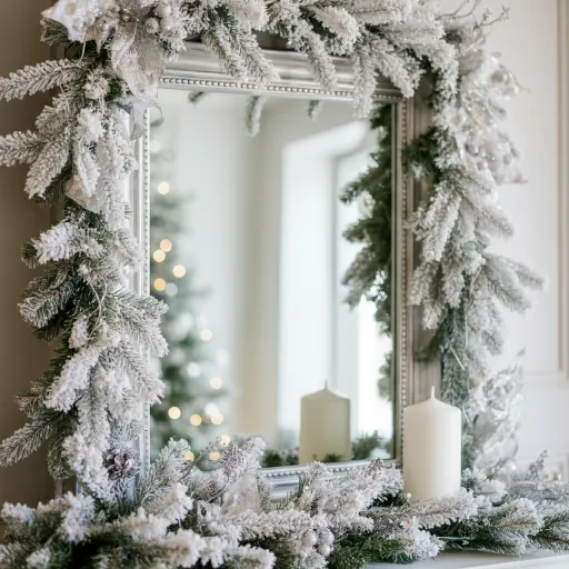 A frosted garland adds just the right amount of winter without making a mess. When styled around a mirror, it amplifies the icy shimmer. Add silver bells or snowflake ornaments for extra charm.