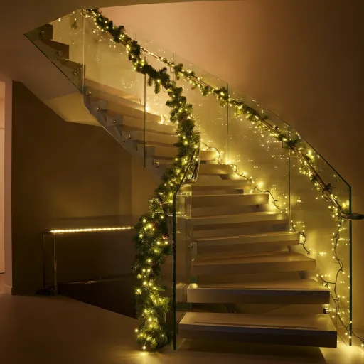 This is the easiest way to make your staircase look stylish without much décor. Wrap a glowing LED rope around simple greenery and boom—you’ve got a clean, modern holiday look. The lights make your stairway pop instantly, especially at night.