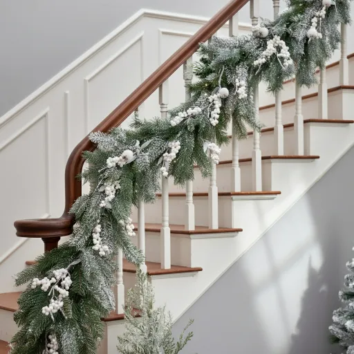 If you love a soft, frosty look, go for a snow-dusted garland. The snowy finish reflects light beautifully and instantly makes your staircase feel dreamy. Add white berries or sparkly ornaments for a winter magic effect. Every year I try this, I end up feeling like I live in a Hallmark movie.