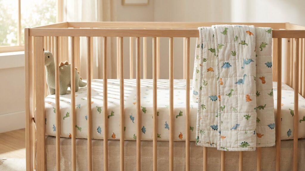A themed bedding set is the quickest way to add charm. Think soft cotton sheets with tiny dinos, a lightweight quilt, or even a crib skirt with footprints. Babies love patterns, and the gentle shapes give them something fun to look at during naps. Choose breathable fabrics and subtle color schemes, so the room stays calm instead of chaotic.