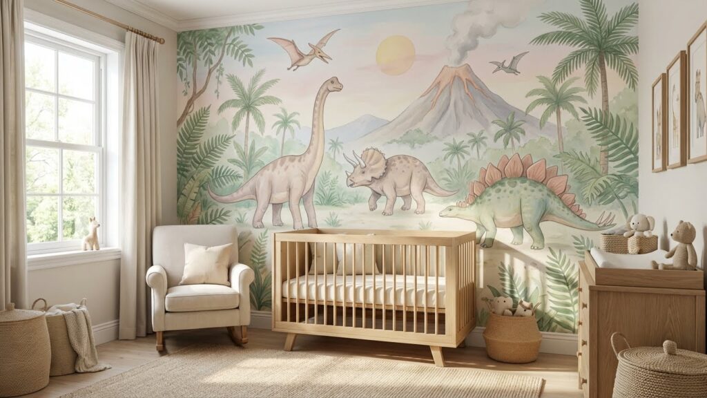 If wallpaper feels too bold, an accent wall is a perfect middle ground. Try stenciled dinosaur silhouettes, textured paint, or a simple geometric design inspired by dinosaur scales. Paint the wall behind the crib or reading nook to add depth and focus. This idea works great in minimalistic nurseries that still want a themed touch.