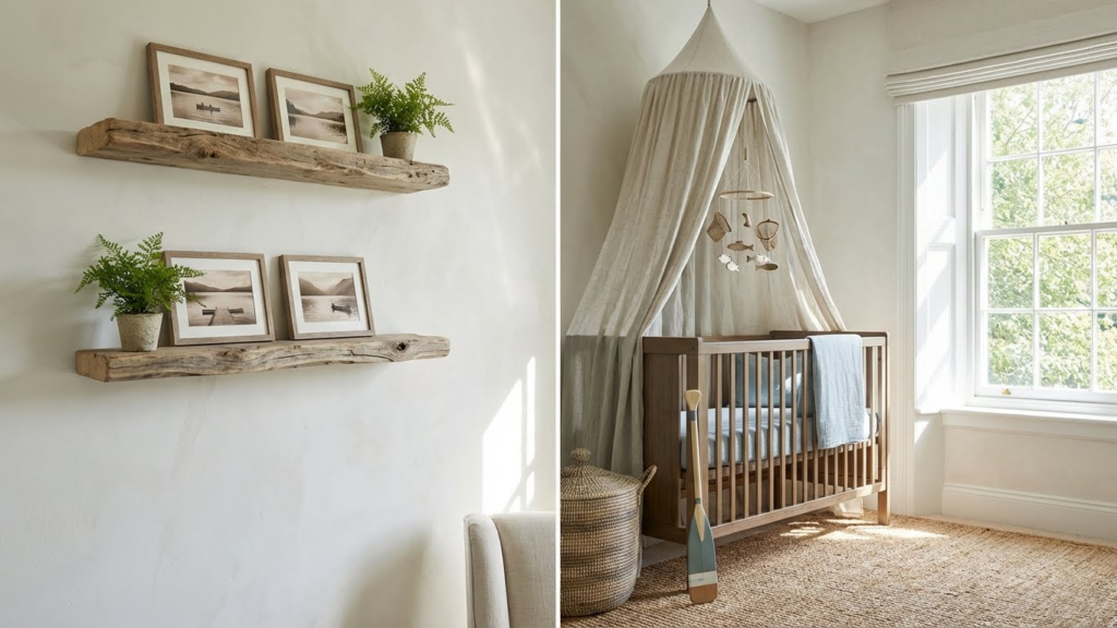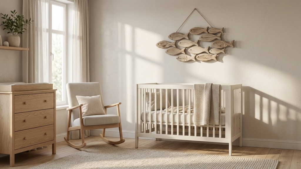 Wooden fish wall art is a classic starting point. It instantly signals the theme without overwhelming the room. Choose light wood, whitewashed finishes, or soft pastel-painted fish. I love grouping three small fish above the crib rather than one large piece—it feels lighter and more playful. This type of decor also ages well, meaning you won’t feel the need to redecorate in a year.