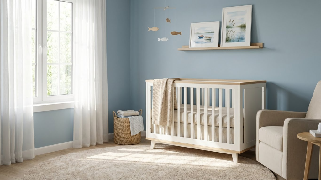 A rug grounds the room visually and practically. Look for subtle outdoor patterns—fish outlines, gentle waves, or forest-inspired designs. Washable rugs are lifesavers. They soften the space and make floor time more comfortable for both baby and parents.