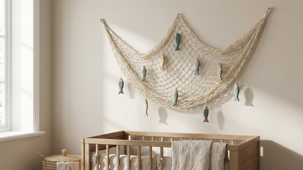 A fishing net brings texture and dimension to the nursery. Drape it loosely and tuck in plush fish, soft fabric letters, or faux greenery. This adds depth without heaviness. Keep it neutral in color so it blends instead of dominates. It’s one of those details that looks great in photos too.