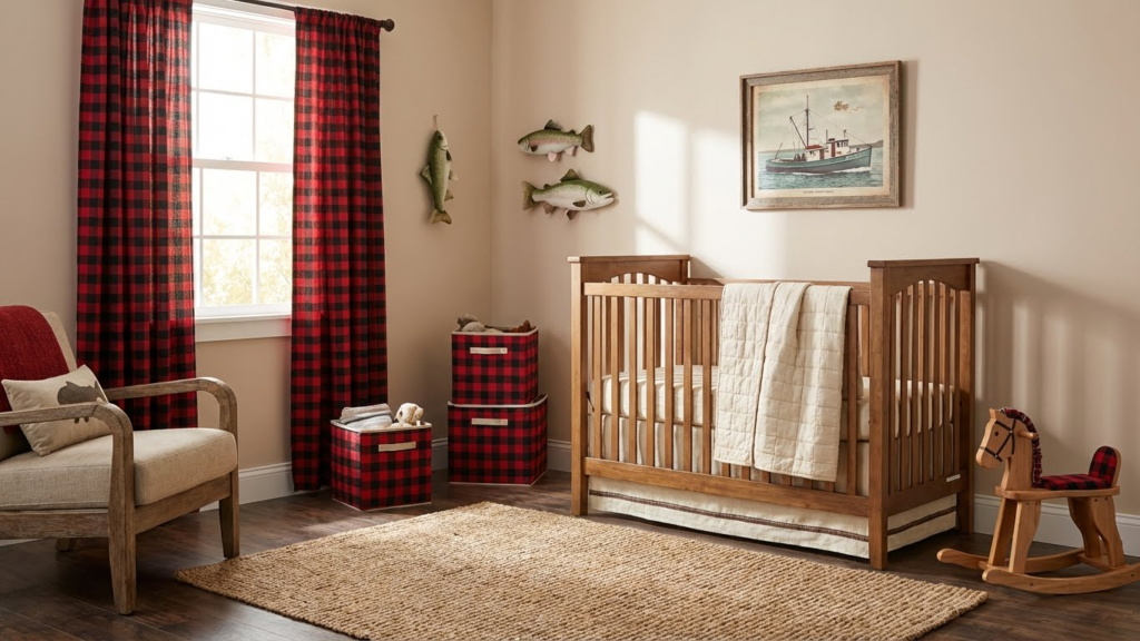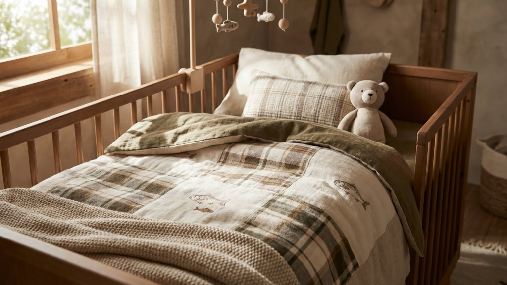 Cabin-inspired bedding brings warmth into the room. Look for soft plaids, tiny fish prints, or simple stripes in muted colors. Avoid loud patterns. Neutral bedding allows you to change decor later without replacing everything. Plus, it photographs beautifully for milestone pictures.