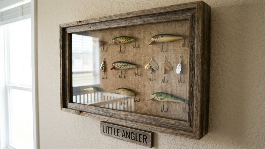 Shadow boxes filled with wooden or vintage-style lures add character without safety risks. Keep colors soft and cohesive. This works well above a dresser or shelf. It’s a great way to honor fishing traditions while keeping the nursery baby-friendly.