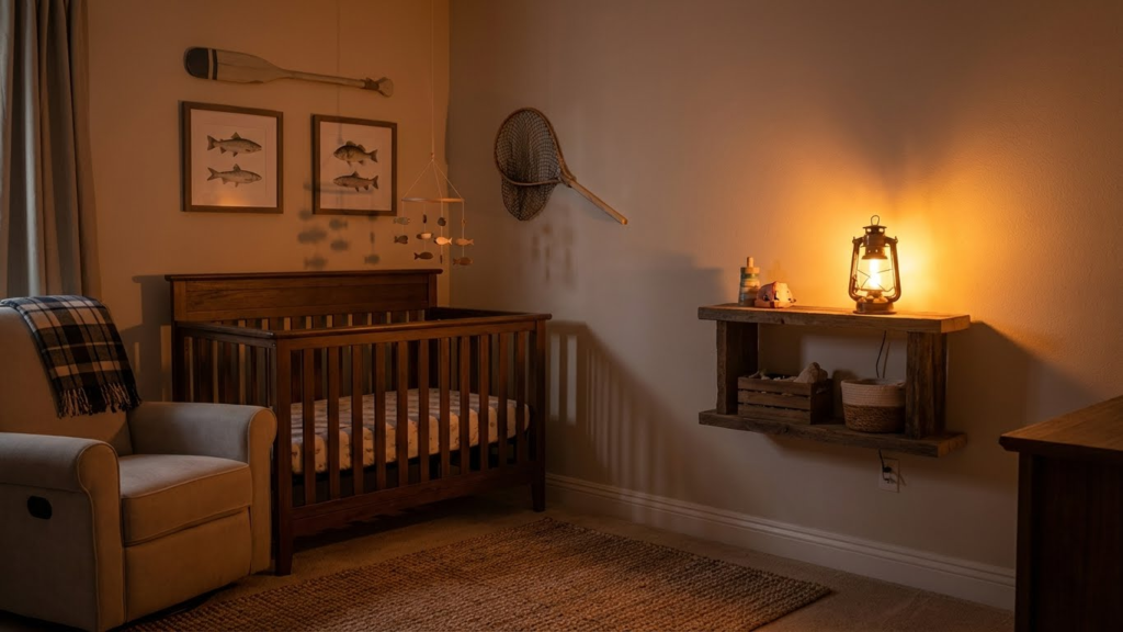 Lantern-style lights give off a warm, gentle glow. They fit perfectly with rustic and fishing themes. Soft lighting helps babies relax and makes late-night feedings feel less harsh. It’s a small detail that makes a big difference.