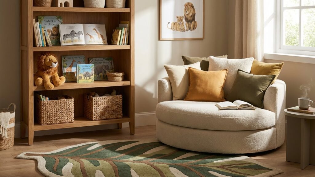 A reading nook turns the nursery into a calm space for bonding. Add a small bookshelf, soft cushions, and a leafy rug. Place a stuffed lion or elephant nearby to keep the theme going. I always recommend a low-light lamp for reading time—it creates a soothing nighttime routine. Over time, this nook often becomes the baby’s favorite spot.