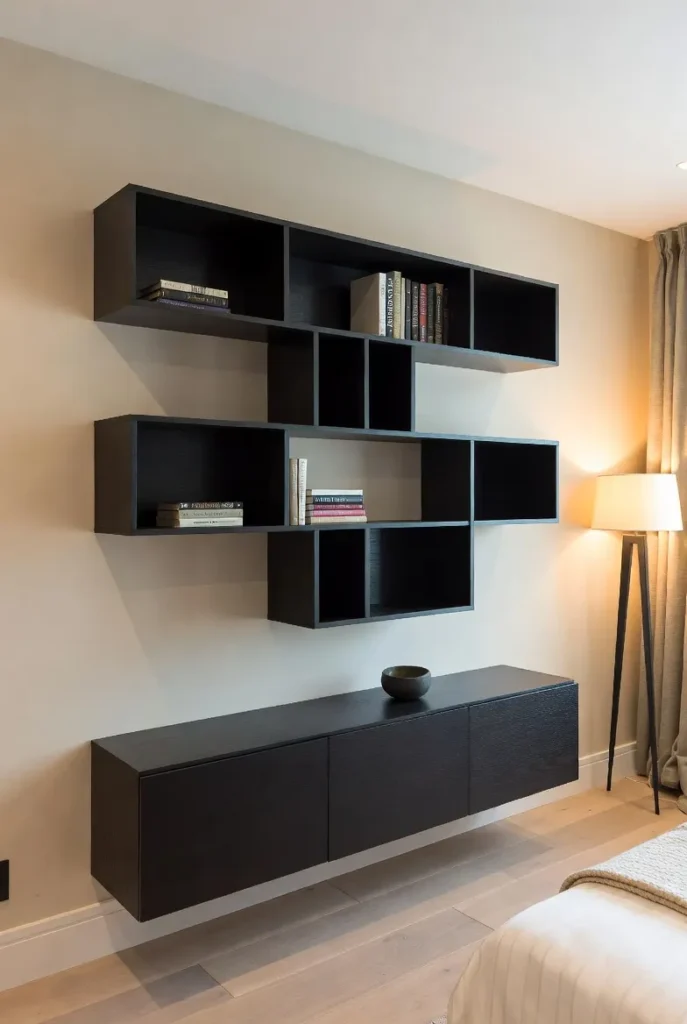 Asymmetrical compartments form a striking wall-mounted bookshelf that blends modern design with minimalism. Books are selectively placed to maintain visual balance, while empty spaces add breathing room. A sleek black cabinet below anchors the setup, offering concealed storage. Decorative accents like a small bowl and floor lamp enhance the cozy ambiance, making the shelving unit a bold yet functional feature in a contemporary bedroom.