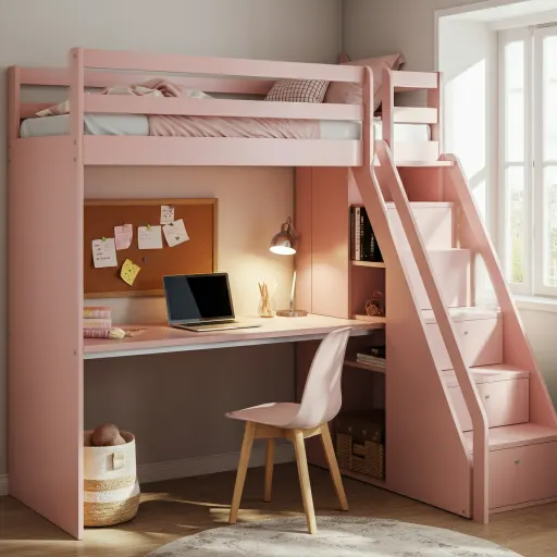 Great for school-age kids, this loft frees up floor space for a built-in desk and pink shelves. Add a comfy chair and Barbie stationery for a cheerful study spot.