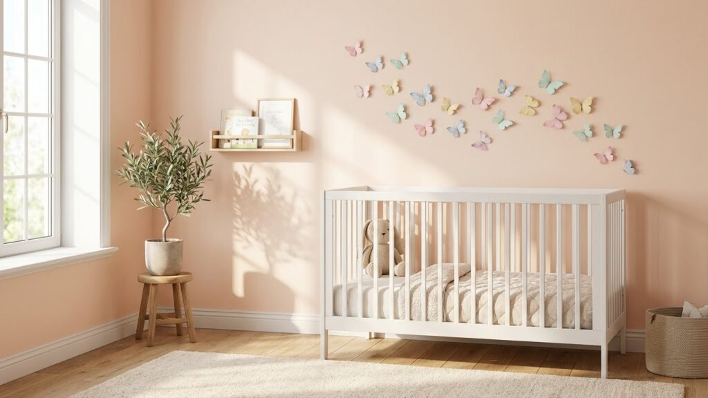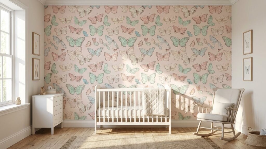 An accent wall with butterfly wallpaper instantly elevates the room. Subtle patterns, pastel gradients, or hand-drawn designs prevent the space from feeling overwhelming. One parent chose a soft watercolor butterfly mural behind the crib, and it became a perfect backdrop for photos and storytelling. Tip: pair wallpaper with neutral furniture to keep the focus on the feature wall while maintaining a balanced, calming environment.