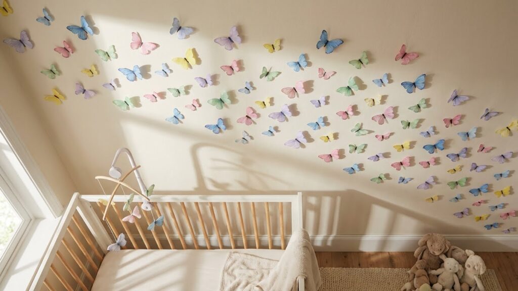 Wall decals are an instant mood-lifter. Choose soft pastels like blush pink, mint green, or powder blue to create a dreamy backdrop. The beauty of decals is their flexibility—you can arrange them as if butterflies are flying upward, diagonally across walls, or swirling around the crib. I remember using pastel butterfly decals in my niece’s nursery; it instantly brightened the room and gave a playful yet sophisticated look without the commitment of wallpaper. For a personalized touch, mix sizes—tiny butterflies in clusters and a few larger ones for focal points. Bonus tip: pair decals with other subtle wall art for a layered, whimsical feel.