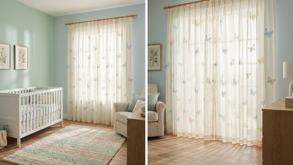 Curtains can enhance a room’s theme subtly. Choose lightweight fabrics with embroidered or printed butterfly patterns. They diffuse sunlight gently, creating a soft, calming glow—perfect for naptime. I love pairing curtains with matching wall decals for a polished, coordinated look. For added versatility, choose neutral base colors with delicate butterfly prints so the room can grow with your child. Functional tip: blackout lining helps maintain consistent sleep patterns while keeping the theme intact.