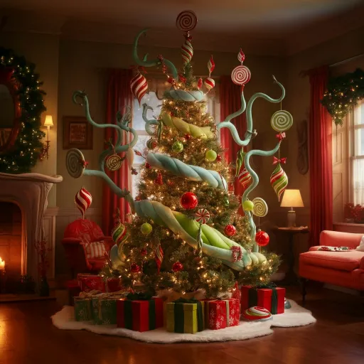 Turn your tree into a storybook scene featuring stolen gifts, candy canes, and tiny Who-Ville houses. Use mismatched ornament sizes to capture that playful chaos from the movie. A swirling ribbon creates motion and ties the whole story together.