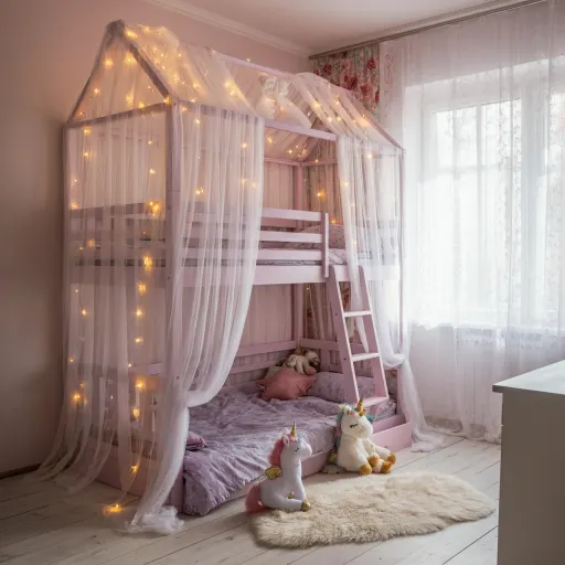 Imagine soft blush walls, a mint-green ladder, and delicate curtains cascading around the top bunk—like a castle in the sky. Add plush pillows and a little reading lamp for bedtime stories.
