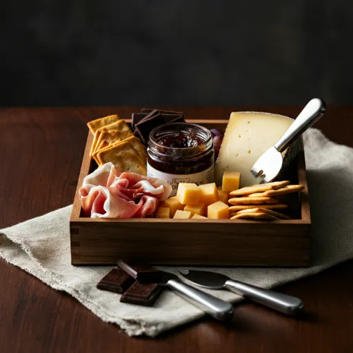 No board needed—just layer salami, aged cheddar, fig jam, crackers, and dark chocolate in a wooden box. Tuck in mini cheese knives and a wine key. Looks luxe, costs under $35.
