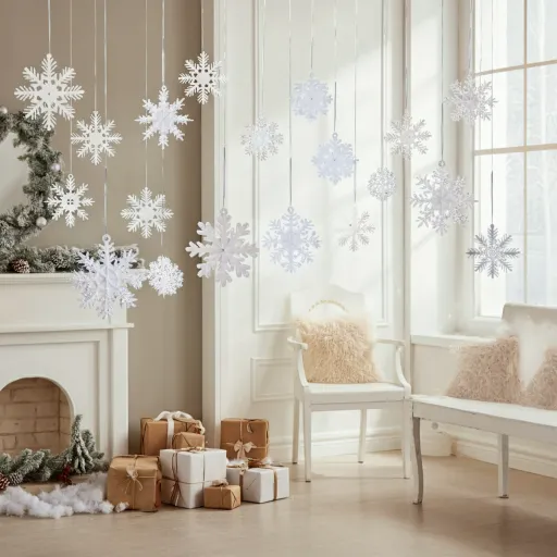 These create that dreamy “winter wonderland” effect. You can use paper snowflakes, acrylic snowflakes, or pre-lit ones. Hanging them at different lengths gives the illusion that they’re drifting in the air. I’ve used this trick for holiday parties, and guests always stop to take photos. It’s subtle, elegant, and super lightweight.