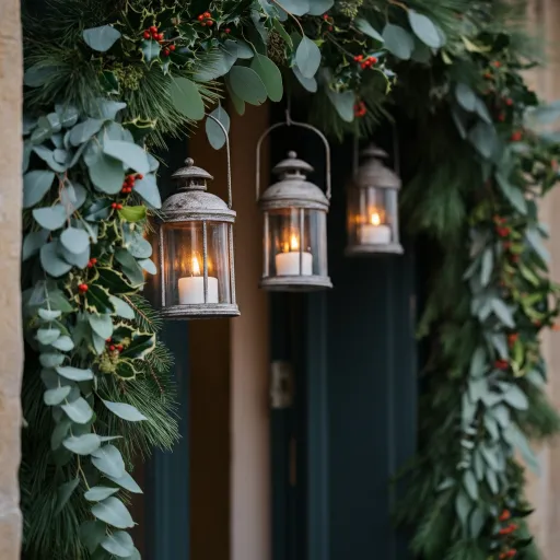 Attach small lanterns to wreaths with holly, pine branches, or eucalyptus. Hang them on doors or above the fireplace to combine greenery and light beautifully.