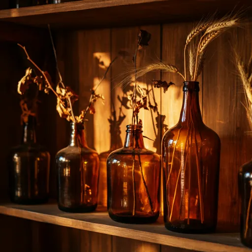 Amber bottles catch light beautifully. Fill them with dried wheat or tiny branches. Vintage thrift finds work best and look like art on their own.