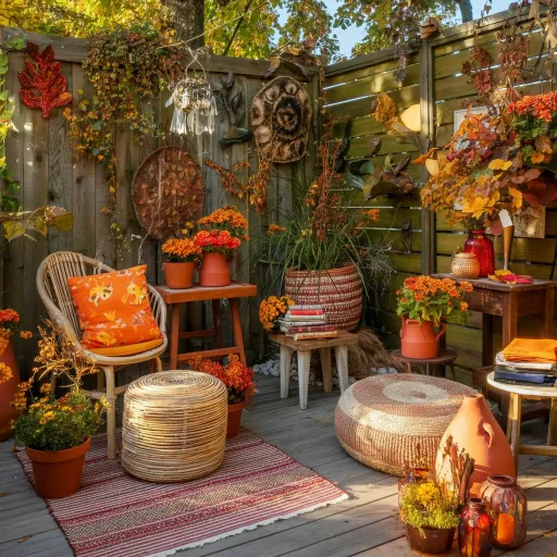 Think of your garden as a canvas and autumn as your palette. Rich oranges, deep burgundies, mustard yellows, and warm browns create instant seasonal warmth. Swap out summer cushions for rust or plum covers. Toss a plaid throw over the bench. Plant fiery marigolds or chrysanthemums in bronze pots, or even repaint a wooden fence in a muted terracotta.