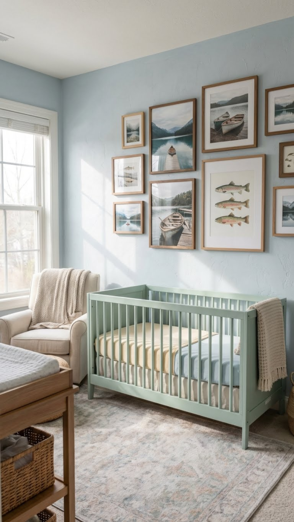 Framed artwork featuring serene lakes, rivers, or fishing scenes brings nature indoors. Combine realistic photography with playful illustrated prints to keep the room interesting. When selecting prints, look for calming blues and greens to maintain a soothing environment. I recommend non-toxic frames and shatterproof glass for baby safety. Wall art can also serve as a starting point for your theme, inspiring other elements like bedding or rugs. A mix of textures, like canvas and wood frames, adds depth and keeps the space visually engaging.