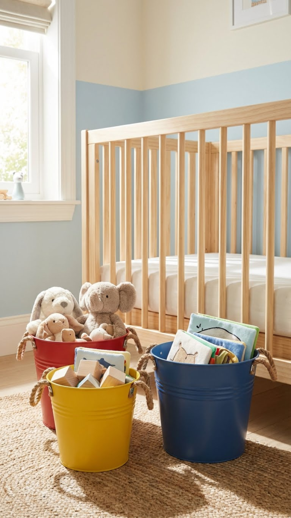 Repurpose small fishing buckets to store diapers, toys, or blankets. Paint them in coordinating colors to make them stylish storage solutions. They’re easy to move around, versatile, and reinforce the theme without taking up much space. Parents love them because they’re functional, inexpensive, and visually appealing. If you’re feeling crafty, add your baby’s initials or small fishing graphics for a custom touch.