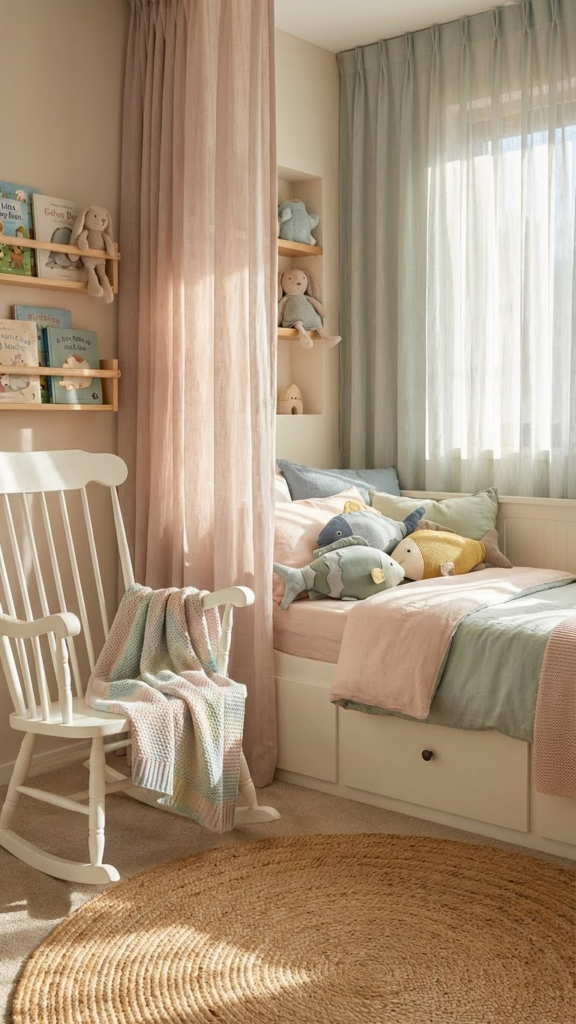 A playful fish-shaped rug under the crib or near the changing table instantly adds color, warmth, and texture. Choose non-slip, washable rugs for safety and practicality. In one nursery I helped style, the fish rug became the favorite spot for tummy time and play. It’s a small investment that brings character to the room and ties together other thematic elements like pillows, bedding, and wall art.