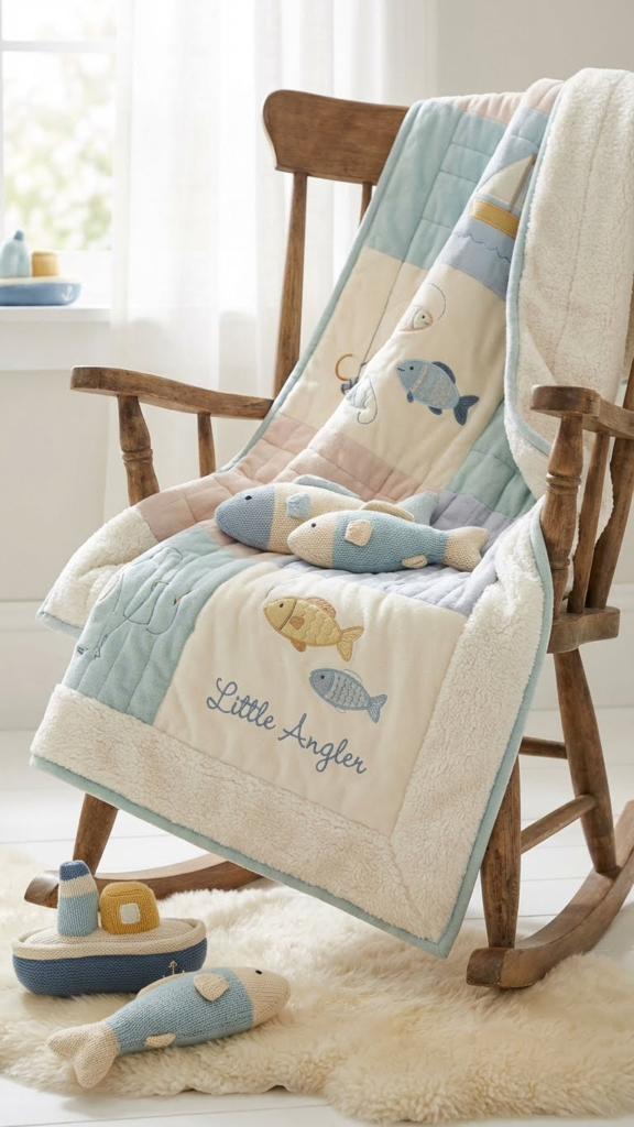 A blanket with fish motifs or personalized with your baby’s name adds charm and functionality. Use it in the crib, stroller, or as a cozy play mat. Soft, breathable fabrics ensure comfort and safety. In one project, a personalized blanket became a cherished keepsake, reinforcing the nursery theme while remaining a practical daily item.