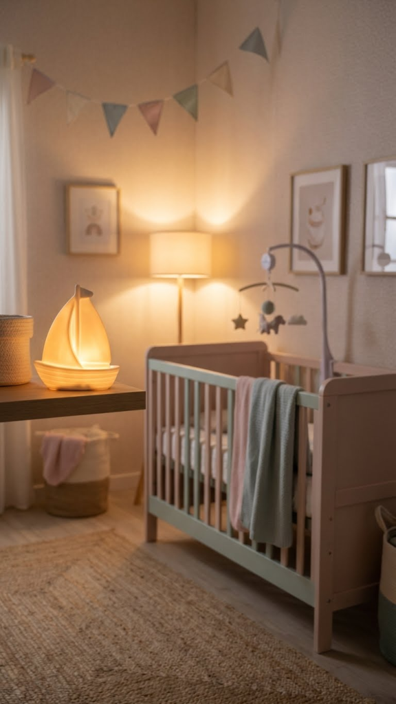 Soft night lighting shaped like a lighthouse, boat, or fish enhances the nursery’s ambiance. Warm, dim lights create a calming effect for bedtime while staying consistent with the theme. Battery-operated options reduce hazards from cords and can easily be relocated. I love night lights because they serve a functional purpose while reinforcing the overall design, making late-night feedings a little more magical.