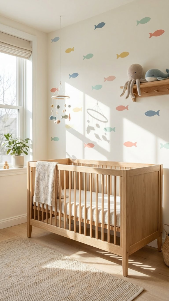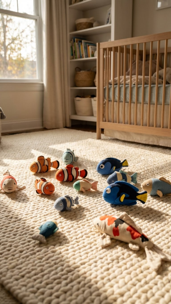 Soft, fish-shaped toys are perfect for decoration now and play later. Scatter them on shelves, in baskets, or on the rocking chair. Choose plushies in different sizes and textures to stimulate sensory exploration. I’ve noticed that even simple stuffed fish can spark imaginative play—they’re easy for babies to grasp and soft enough to cuddle. Opt for high-quality, hypoallergenic fabrics to ensure safety. Bonus: they’re easy to clean, and they double as decor that doesn’t feel cluttered.