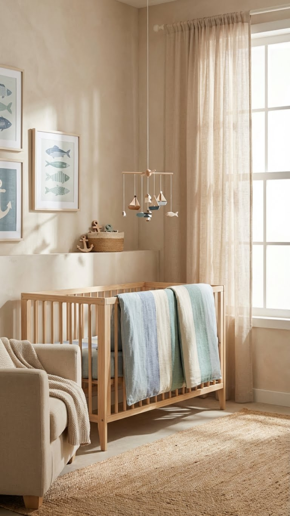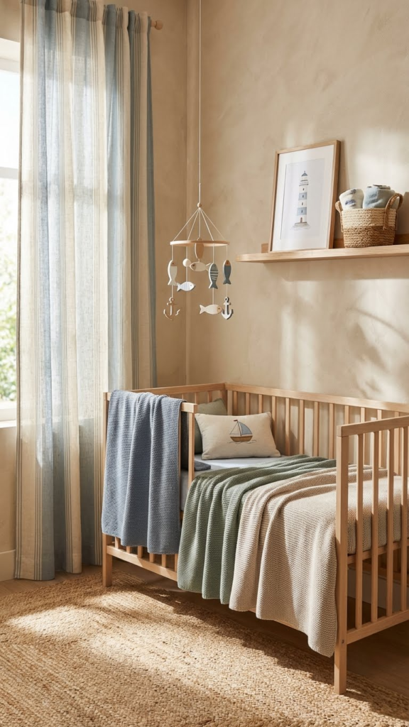 Imagine walking into the nursery and seeing a crib that looks like a miniature fishing boat. Not only is it visually striking, but it also instantly sets the theme. Look for cribs with rounded edges and pastel tones like soft blues or seafoam green. Add rope handles or a small anchor decal for authenticity. Personally, I recommend pairing it with neutral bedding so the crib remains the focal point. If you’re on a budget, consider a standard crib and adding wooden panels or decals to mimic a boat design. Your little one may not notice the theme now, but it makes for adorable photos and a fun centerpiece as they grow.