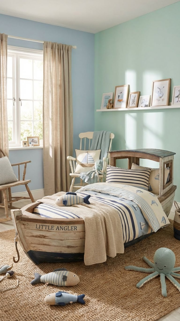 A bookshelf shaped like a canoe or boat adds both decor and function. Use it to display books, small toys, or framed photos. Rounded edges ensure safety, and a sturdy build prevents tipping. In one nursery, the bookshelf became a mini reading corner where parents and babies could bond over bedtime stories. It’s both decorative and practical, making it a win-win addition to any fishing-themed room.