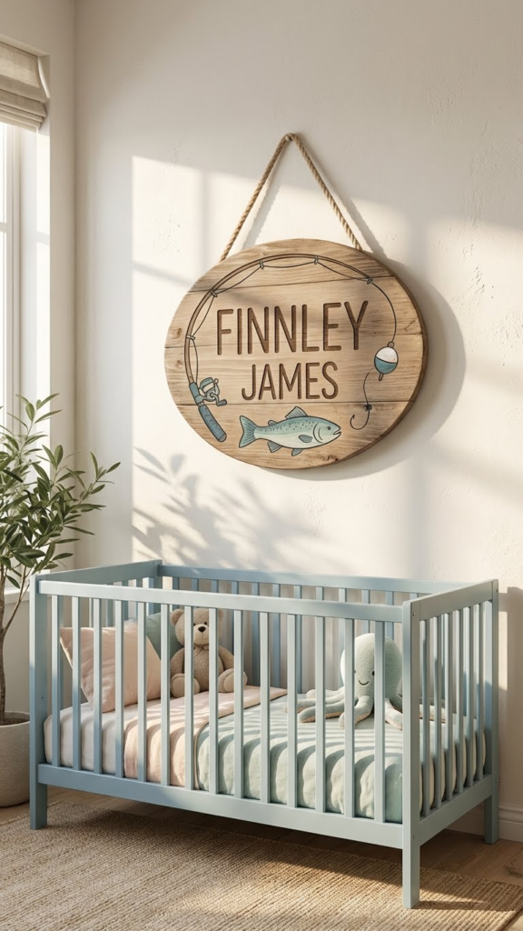 Add a personalized wooden sign featuring your baby’s name and fishing graphics. Hang it above the crib or as part of a gallery wall for a rustic, lakeside charm. Wooden decor introduces warmth and a natural texture, perfect for complementing other wooden furniture or accents. Personally, I like signs with subtle colors and carved details—it feels handcrafted and timeless. Bonus: it makes for a memorable baby room photo prop.