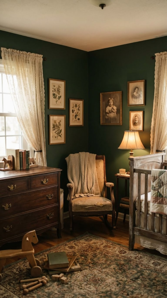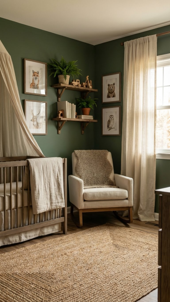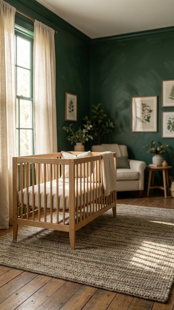 Dark green walls feel grounded and calming, almost like bringing the outdoors inside. Pair them with a natural wood crib or dresser to soften the look. I’ve noticed this combo works beautifully in rooms with even a little daylight. Add cream bedding and a soft rug to balance the depth. It feels cozy, not heavy—and it grows well with your child.