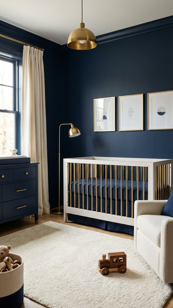 Navy feels classic and comforting. Pair it with brass or gold hardware for a touch of warmth. I love how navy works for day and night—it feels cozy at bedtime. Add white or cream furniture to keep the room balanced. A simple star or moon theme fits naturally here.