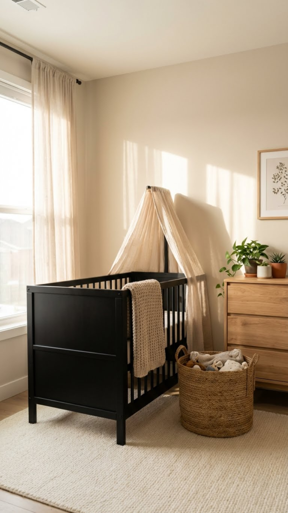 A black crib anchors the room instantly. It sounds bold, but it works when paired with lighter walls or bedding. Add natural wood or woven baskets nearby for warmth. This idea feels modern and intentional. Plus, black furniture ages beautifully as kids grow.
