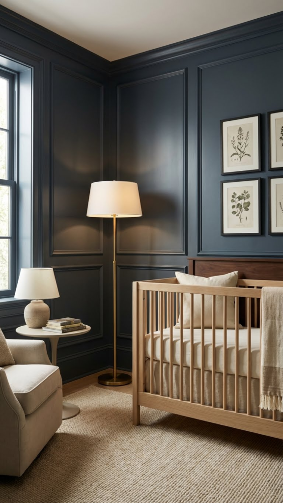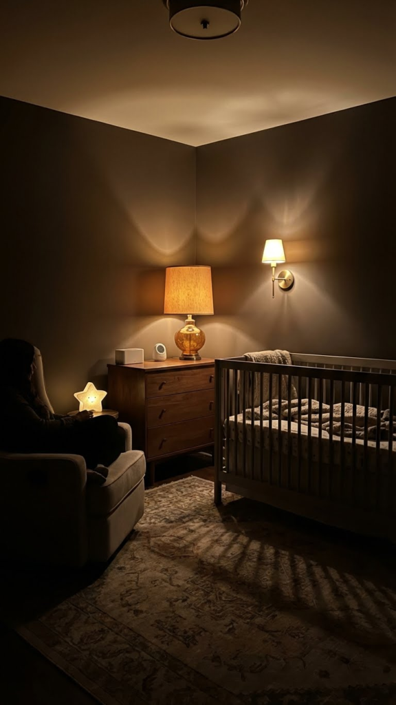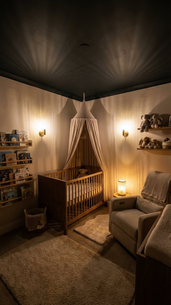 Lighting makes or breaks a moody nursery. Skip harsh overhead lights and layer soft lamps, wall sconces, and nightlights. Warm bulbs create a peaceful glow for nighttime feeds. I always recommend dimmers if possible—they’re a game changer. Soft light makes dark colors feel comforting.