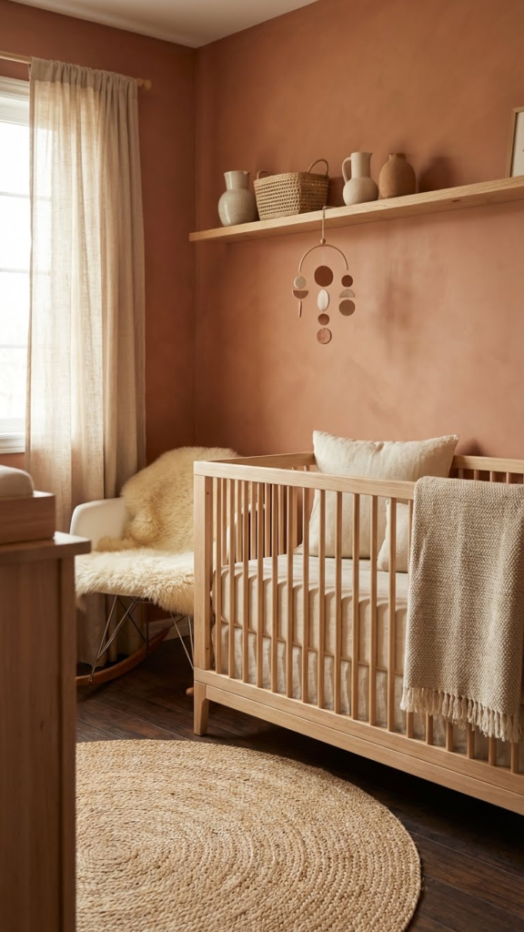 Warm browns and clay shades feel incredibly cozy. These colors wrap the room in warmth without feeling too dark. Pair with cream textiles and simple artwork. I’ve found this palette especially calming for newborns. It feels natural, grounded, and timeless.