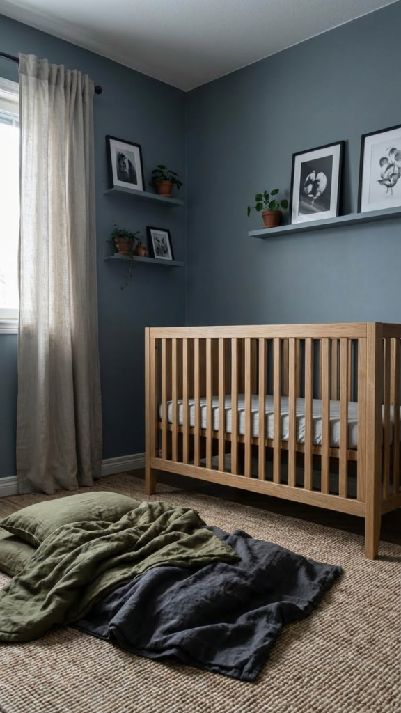 Deep neutrals like slate, olive, and warm gray work beautifully for any gender. Skip themed décor and focus on textures instead. A neutral moody nursery feels modern and flexible. It’s a smart choice if you want the room to grow with your child.