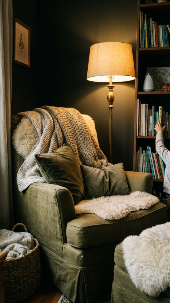 Add a small chair or floor cushions in a dark corner. Use soft lighting and plush fabrics. This creates a quiet space for reading and bonding. Even babies benefit from calm, defined areas. It makes the nursery feel intentional