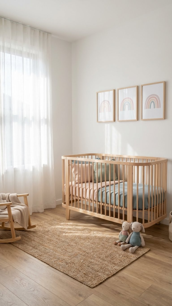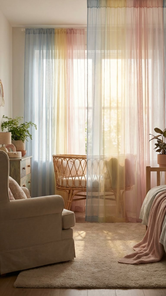 Sheer curtains with faint rainbow threads or ombré effects add charm without blocking light. Natural light makes any nursery feel more open and calm. This is a subtle way to introduce color while keeping the room airy.