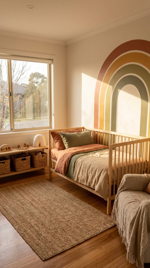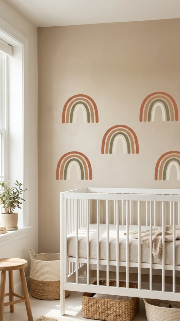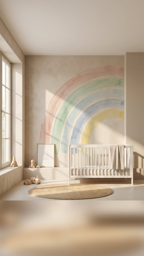 Instead of painting bold stripes, try a faded rainbow mural or watercolor-style wall. This adds personality without visual chaos. One mom told me she painted just one wall and kept the rest neutral—best decision ever. It becomes the focal point while everything else stays peaceful.