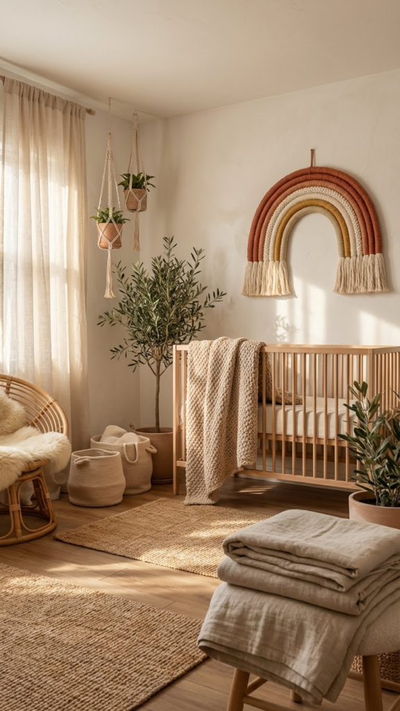 Macramé rainbow hangings are a Pinterest favorite for a reason. They add texture, warmth, and a handmade feel. Hang one near the crib or reading nook. I love how they soften the room and pair beautifully with plants, woven baskets, and linen curtains.