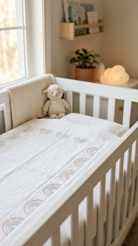 Instead of loud patterns, opt for simple rainbow stitching or tiny arches on sheets. This adds charm without overstimulation. I’ve noticed minimalist bedding photographs better and feels calmer during bedtime routines. Less visual noise equals better sleep—for everyone.