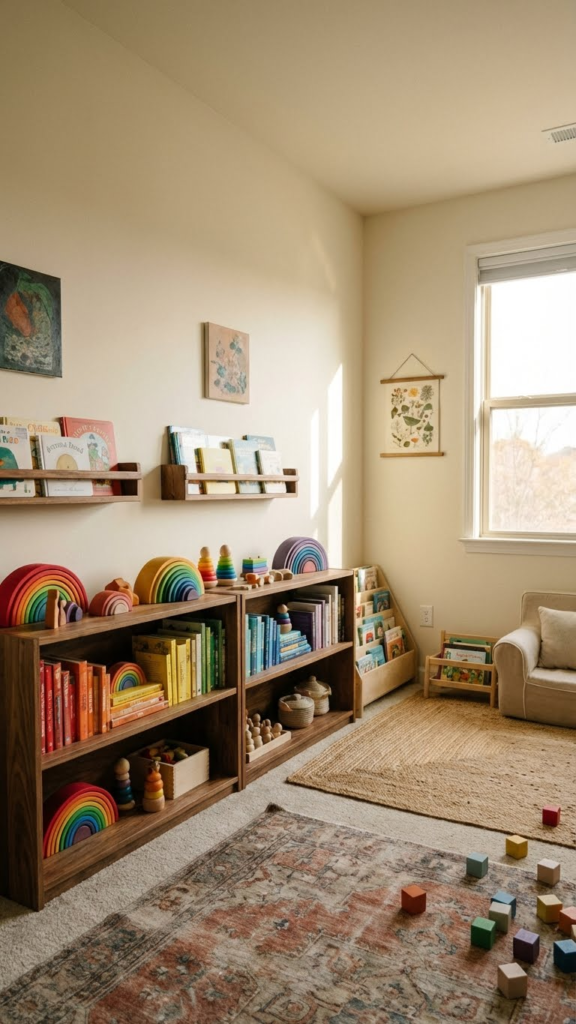 Low shelves with colorful books and toys create a playful learning space. Arrange items by color for a subtle rainbow effect. It looks organized but still fun. This setup encourages independence later, which is a win you’ll appreciate sooner than you think.