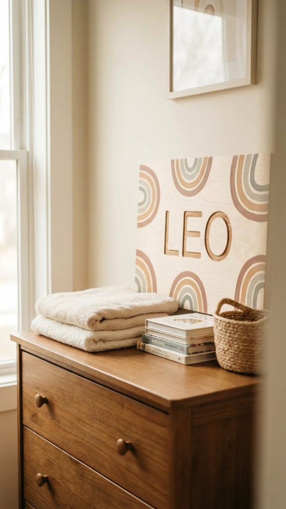 Personalized name signs with subtle rainbow details feel special and thoughtful. Hang it above a dresser or reading corner. It adds character without clutter. Parents often say this becomes their favorite keepsake piece.