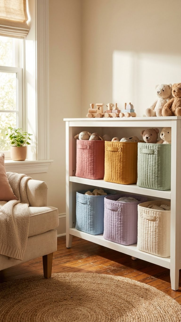 Storage bins in soft rainbow colors keep things organized and cheerful. Label them or arrange by shade. It turns cleanup into a visual treat and makes the room feel intentional rather than cluttered.