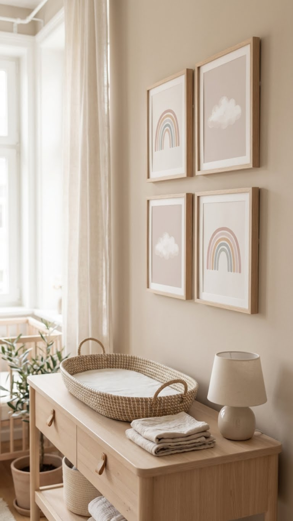 Create a small gallery wall with rainbows, clouds, and soft quotes. Keep frames neutral. Three to five pieces are enough. This works beautifully above a changing table or reading nook and feels polished without trying too hard.