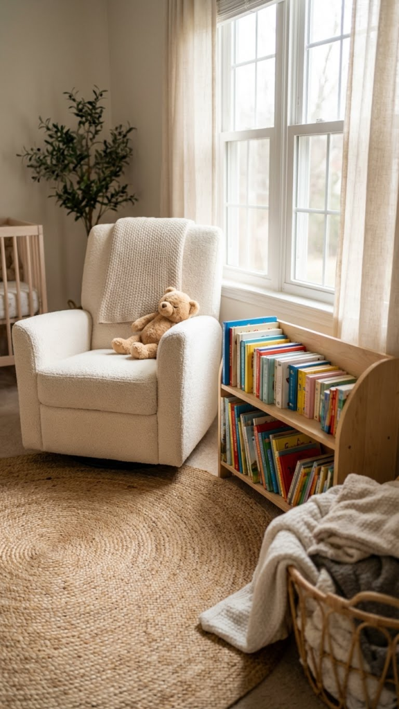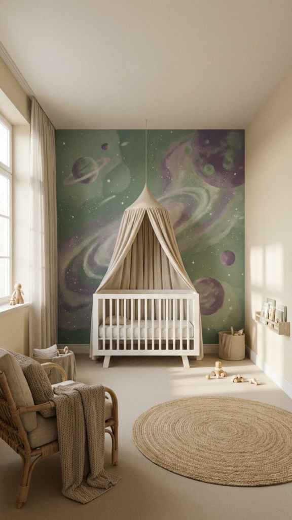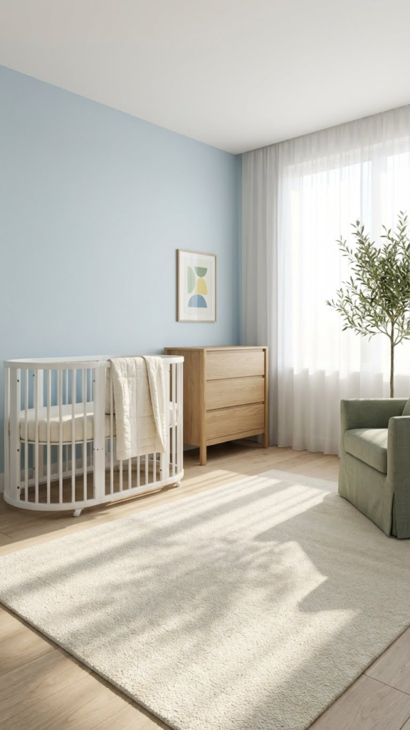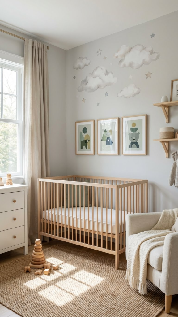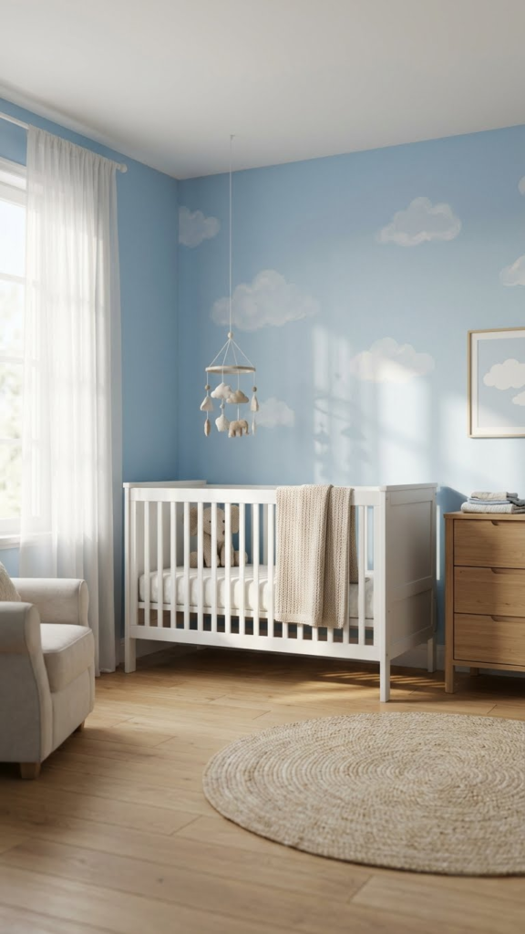 This setup works especially well for small nurseries because it visually opens the room. Add cloud decals or framed art rather than murals if you want something easy to remove later. It’s simple, timeless, and very baby-friendly.